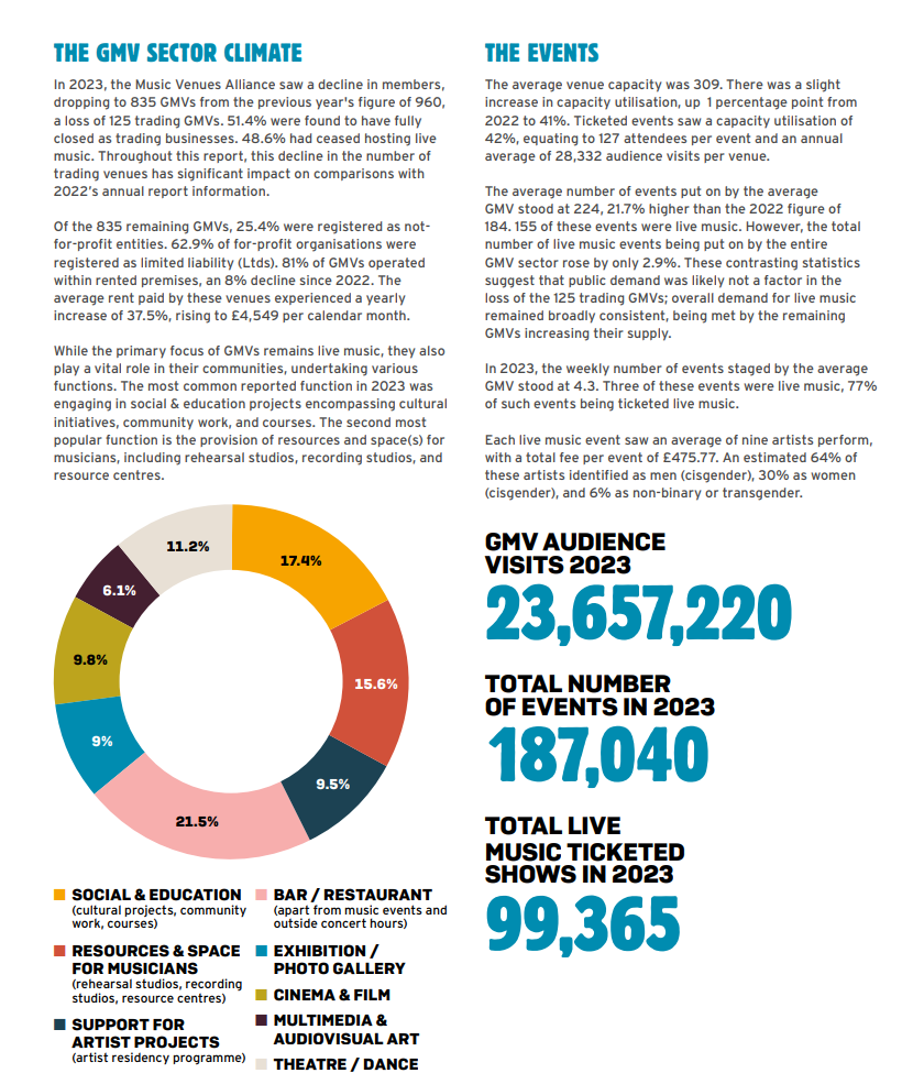根据外媒MBW报道,据英国音乐演出慈善机构MVT(音乐场馆信托基金)统计,在过去一年里,平均每周有两家基层音乐场馆(Grassroots Music Venues, GMVs)关闭,指的是平均可容纳309人,但极限容量可能超过650人的场馆。更令人震惊的是,在其《2023年度报告》中显示,38.5%的基层音乐俱乐部出现年度财务亏损的情况。