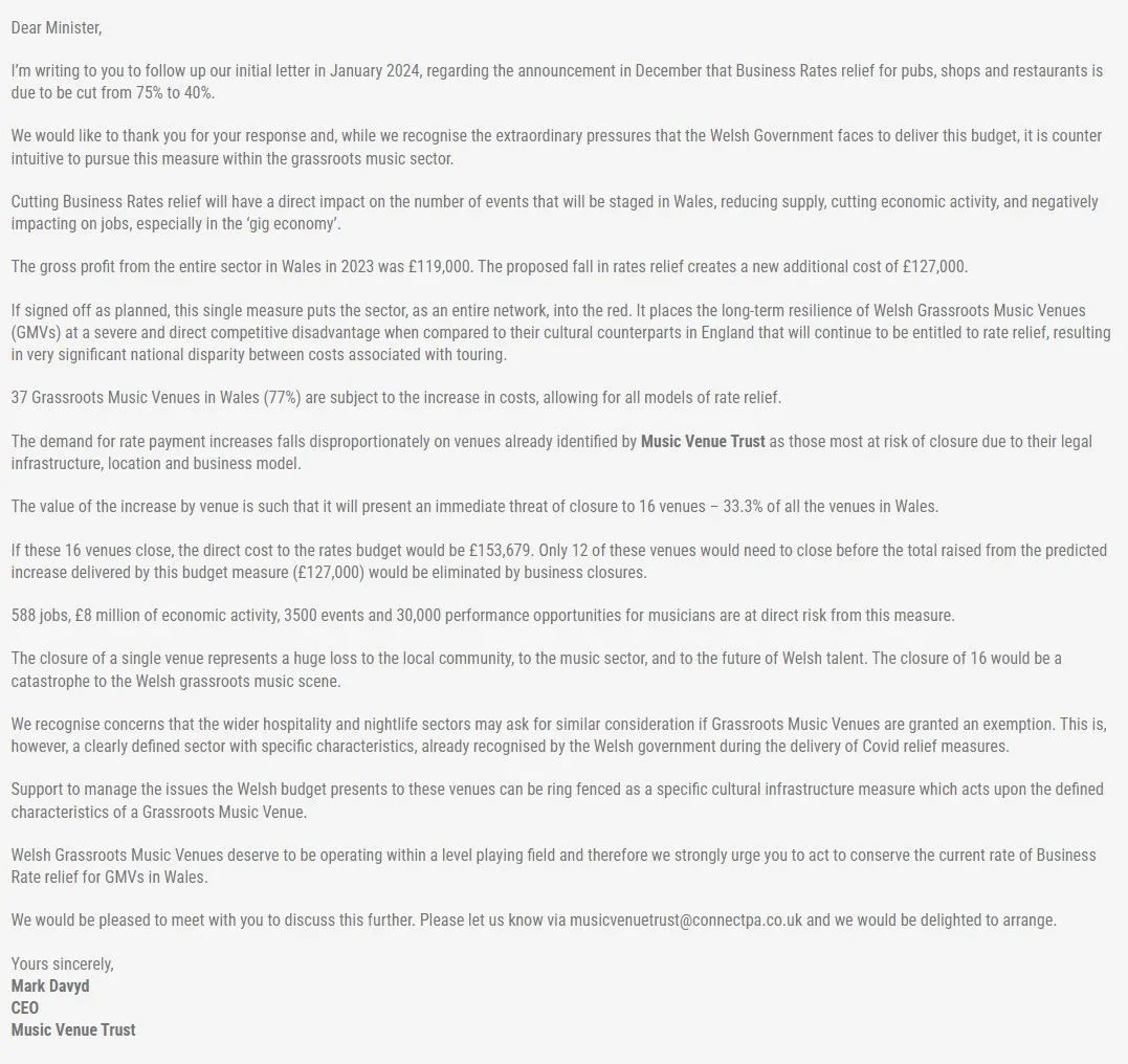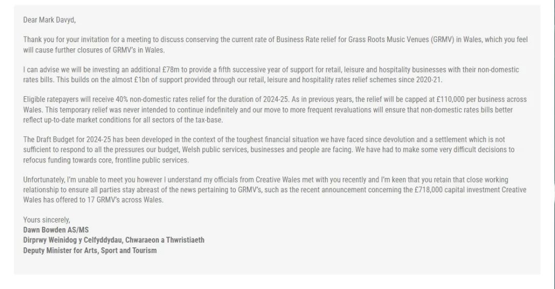 Mark Davyd表示,目前MVT已经在初步尝试一些解决的办法。在今年年初,他写信给英格兰威尔士政府,请求政府重新考虑对小型音乐俱乐部的商业税减免政策。信中强调了减少税收减免对威尔士草根音乐场景的潜在负面影响,并呼吁保持75%的税收减免率,以避免对文化场所造成经济损失和关闭风险。