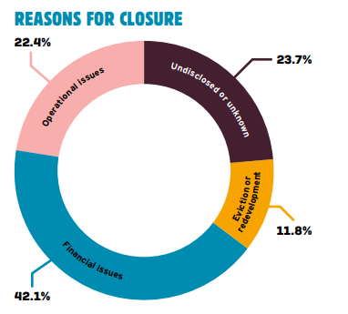 报告提到,经调研,42.1%场馆因为经济原因导致关闭,22.4%是因为运营困难。其中,以下原因被认定为导致永久关闭的原因,如因能源价格、商业税率、供应成本或租金导致的债务和破产;客流量减少和运营成本的提升导致的财务困境;疫情导致的相关限制措施,以及对经济和物流的影响;噪音减少令的颁布、其他与场所活动相关的纠纷;场所的营业执照被吊销或无法实现的执照更新条款;场地建筑为重新开发改造而被出售等。