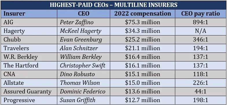 全美多险种公司薪酬最高CEO,数据截至2022年底,数据来源:S&P Global