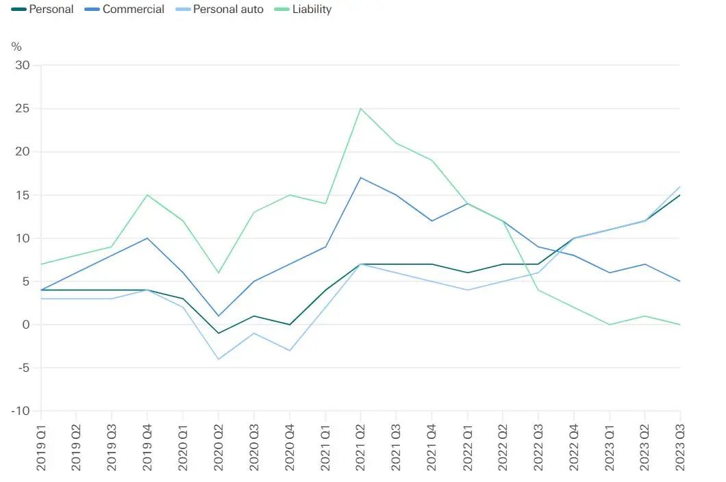 美国保险业直接费率增长,数据截至2023年Q3,数据来源:Swiss re Institute