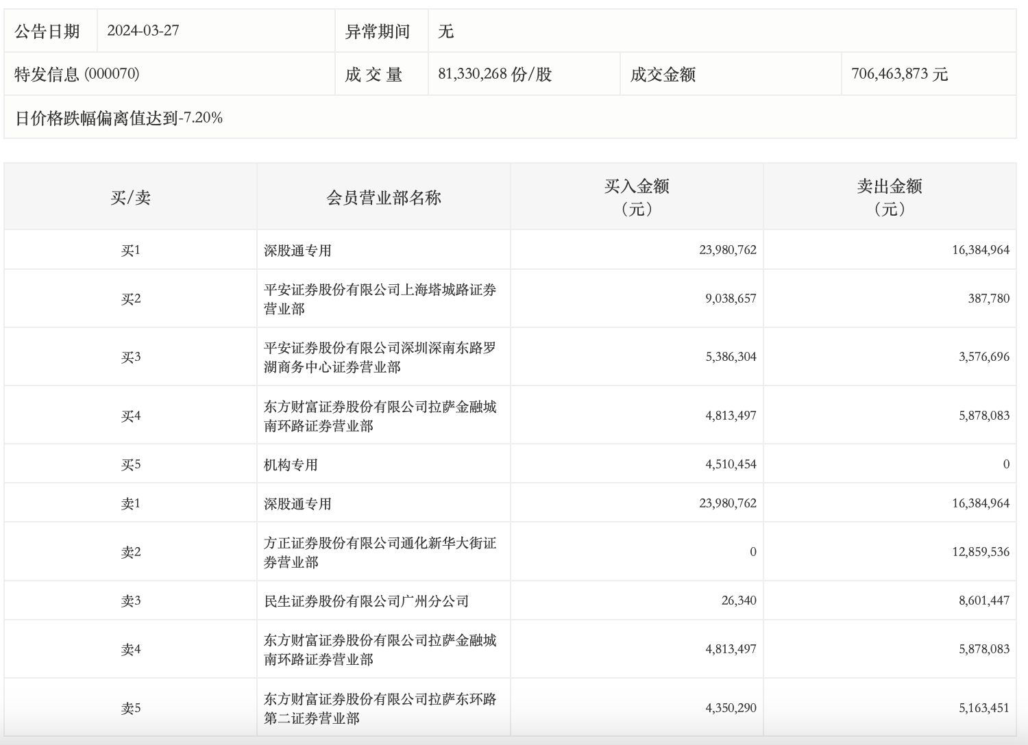 3月27日,特发信息今日跌停,全天换手率达9.15%,振幅达10.08%。龙虎榜数据显示,营业部席位合计净卖出74.57万元。其中,机构合计净买入451.05万元。此外,深股通专用、方正证券通化新华大街证券营业部分别卖出1638.50万元、1285.95万元;深股通专用、平安证券上海塔城路证券营业部分别买入2398.08万元、903.87万元。