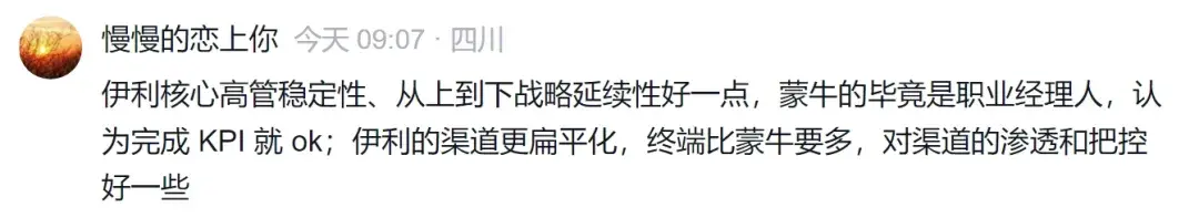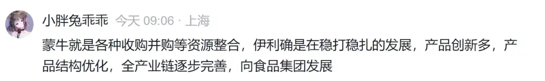 在此基础上,有雪球用户认为,蒙牛是各种收购并购进行资源整合,伊利则是稳扎稳打的发展,产品创新多,高管也更稳定,从上到下的战略延续性更好。