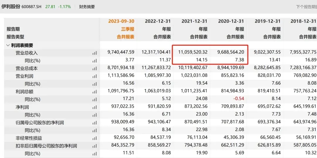 在收入超出蒙牛约30%的情况下,伊利的净利润更是达到蒙牛的一倍之多。2023年前三季度,伊利净利润为93.7亿元,算上四季度的数据,超过蒙牛一倍几乎是没有悬念的。