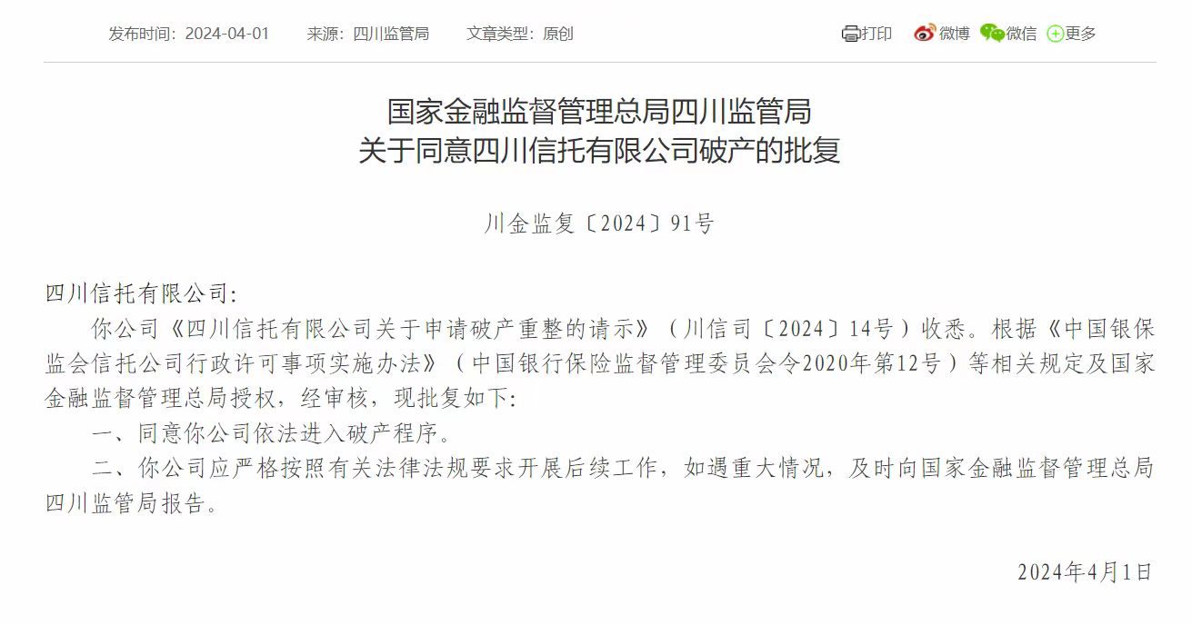 4月1日,国家金融监督管理总局四川监管局批复,同意四川信托有限公司依法进入破产程序,要求该公司严格按照有关法律法规要求开展后续工作,如遇重大情况,及时向国家金融监督管理总局四川监管局报告。