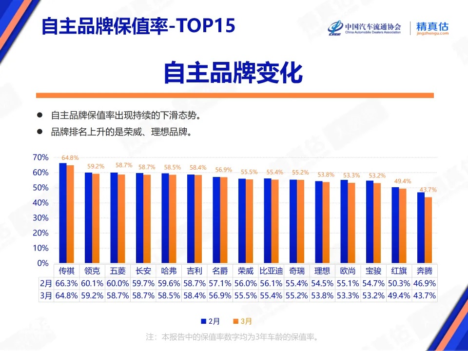 自主品牌领域,传祺、长安、吉利等头部公司的产品凭借其知名度和产品力,在价格战环境下仍维持较高保值率;合资方面变化不大,其中美系车在本月保值率超过大众,法系车则出现小幅回升;豪华品牌方面同样保持稳定,二线豪华品牌如凯迪拉克和捷豹在保值率上出现小幅上升。