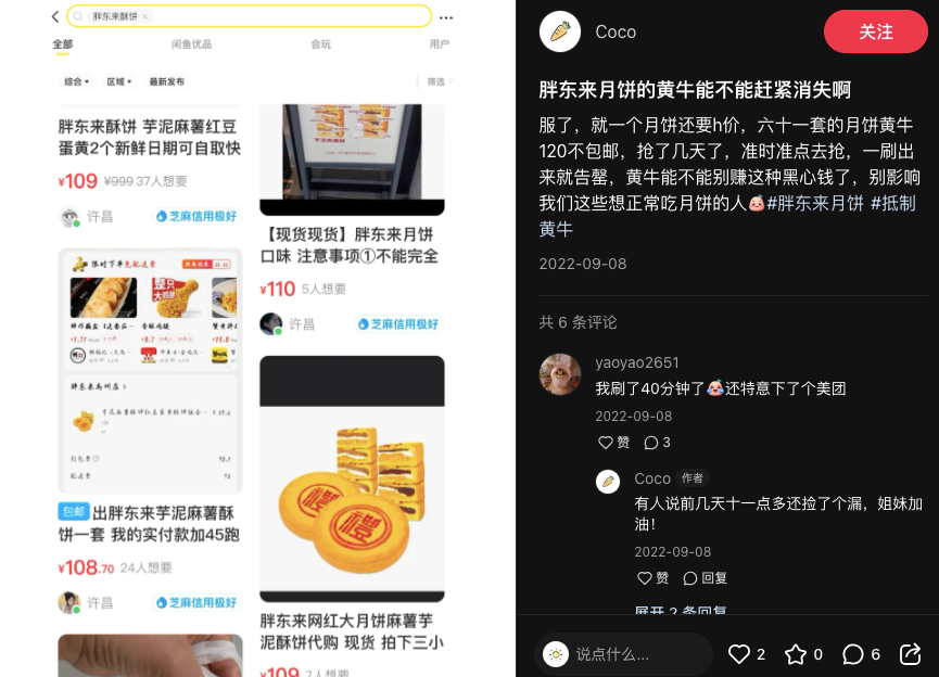 黄牛现在咬到了这条大动脉,一个茶叶号,加价100,月饼直接翻番,本来价廉的东西,价不廉了。更严重的是本来物美的东西,也不一定了,因为浑水摸鱼卖假货。
