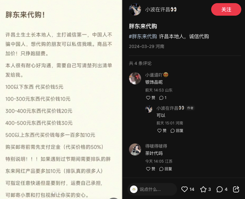 代购像蜂,蜜蜂的蜂。比如很多家在当地的百姓,随手做点代购生意,商品不加价,只赚跑腿钱,算下来比外卖费都便宜。还有人只是免费为朋友买点东西。