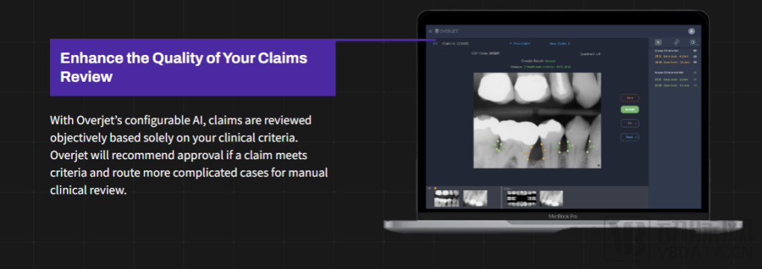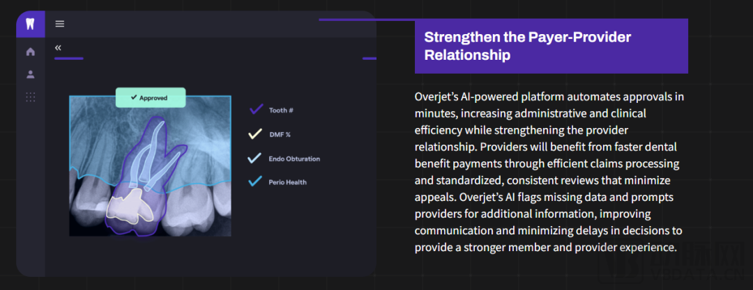 作为此次融资事件的主角,Overjet也主要是将AI用于诊疗端——其通过自主开发的AI平台对牙科患者的数据进行分析,以确定患者需要什么治疗,以及得到更精准的诊断意见。