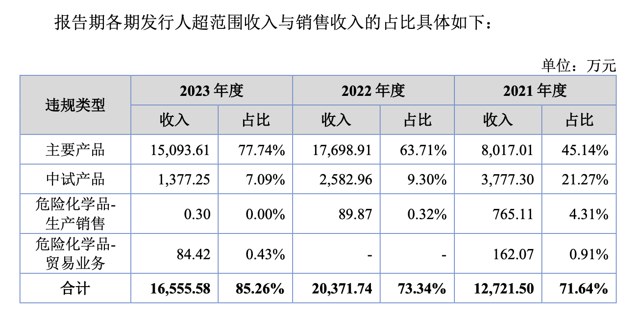 报告期内,永创医药超范围生产经营主要包括超出安评批复和环评批复范围销售化工产品、超范围销售未备案的危险化学品两种情形,其中超出安评批复和环评批复范围销售化工产品包括销售主要产品(2-溴-5-氟三氟甲苯、对三氟甲硫基苯酚)和中试产品。