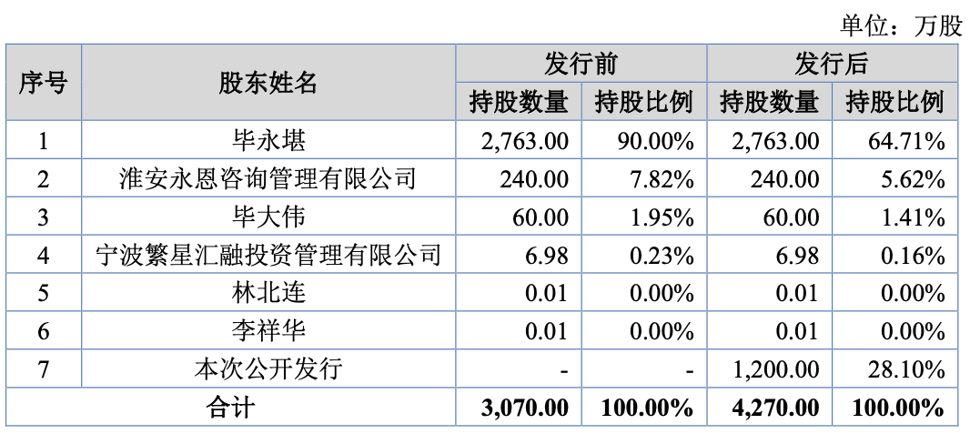 IPO前,毕永堪直接持有公司2763万股股份,占本次发行前公司总股本的90.00%,为公司的控股股东、实际控制人。此外,毕永堪的儿子毕大伟持股1.95%。
