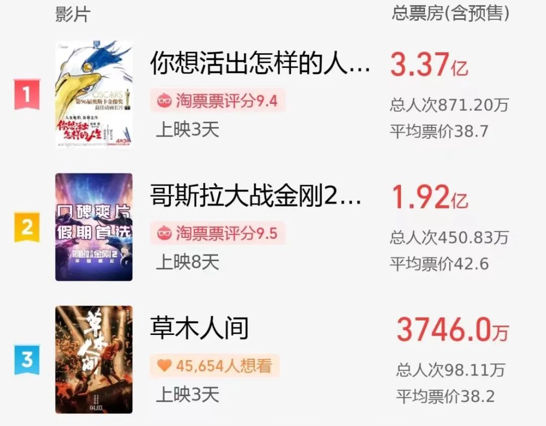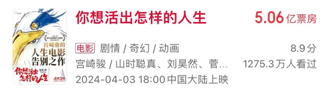 档期内,《你想活出怎样的人生》一家独大,以3.99亿摘得内地影史清明档冠军,截止发稿前,累计票房已超过5亿,剑指《铃芽之旅》去年创下的日本动画电影最高票房。