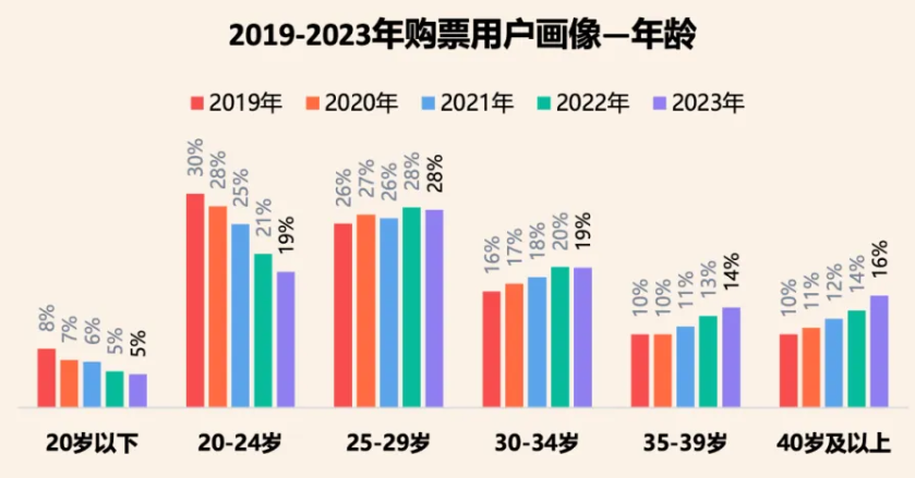 2023年内地全年观影人次达12.99亿,创近4年来观影人数新高,但是观影群体结构发生了很大的变化。根据灯塔《2023中国电影市场年度盘点报告》显示,25岁以下观众自疫情之后呈现持续下降的趋势,25-29岁市场主力观众占比稳定,30岁及以上成熟群体占比连年上涨。