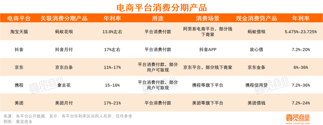 壹览商业统计了主流电商平台相关联的消费分期产品以及现金消费贷发现,根据个体资质差异,各平台消费分期产品年利率多在13%到20%区间。现金消费贷产品年利率最高则可达36%,值得注意的是,在办理借款的过程中,36%是一个敏感的数字。如果贷款利率超过了36%,那么贷款机构就违法了,会被认定为高利贷。在这种情况下所有的借款事宜均为无效。