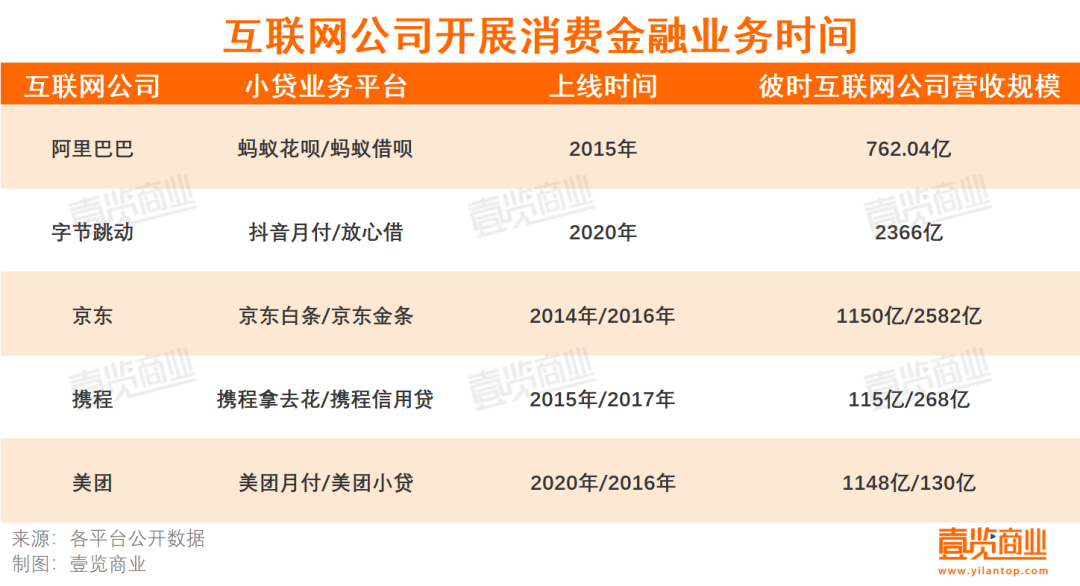 壹览商业统计各企业小贷业务相关平台上线时间、彼时互联网巨头们的营收规模发现,大多数电商平台是在百亿营收量级时开始考虑做的小贷生意。