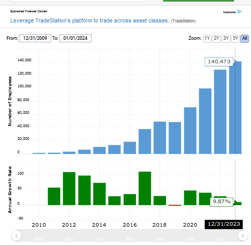 特斯拉的人员增长的确很快。年报显示,截至2023年底,特斯拉的员工数量为140473人。而这一数字在2020年至2022年分别为70757人、99290人、12855人。