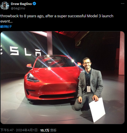 巴格里诺也许早已做好准备,他上一次发布X消息是在4月1日,附照片,追忆2016年特斯拉Model 3的发布。