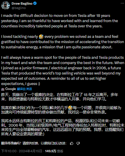 在X上,巴格里诺发布告别信息,马斯克也在下面回复“感谢你为特斯拉做的一切,几乎没有人如你般贡献大。”