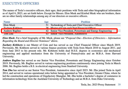 在特斯拉此前公开的信息中,巴格里诺是公司全球仅有的四大高管之一。其他三位是CEO马斯克、CFO扎克·科克霍恩,以及去年新晋的特斯拉汽车业务高级副总裁朱晓彤。值得注意的是,其中科克霍恩也已于去年8月离开特斯拉,结束其在此13年的工作。