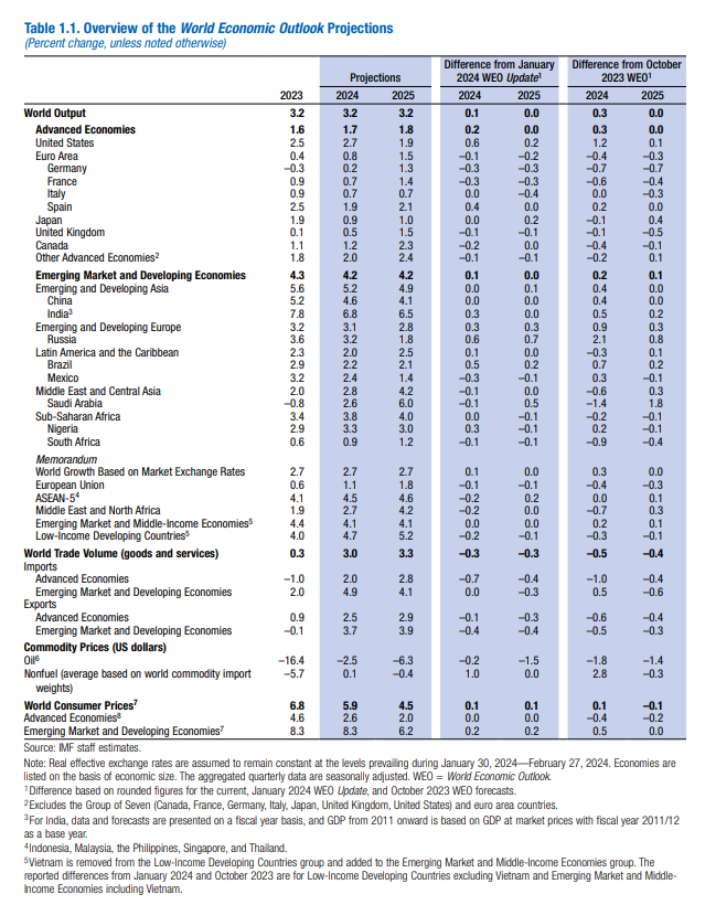 除上述国家和地区,IMF预计新兴市场和发展中经济体2024年和2025年的增长率将稳定在4.2%,和1月时的预测相比,2024年新兴市场和发展中经济体增长率预测上调了0.1个百分点。