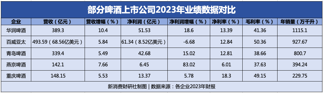 从2023年业绩来看,行业TOP5华润啤酒、百威亚太、青岛啤酒、燕京啤酒以及重庆啤酒均实现营收增长。除了百威亚太之外,另外四家中国啤酒巨头也实现了净利润增长。