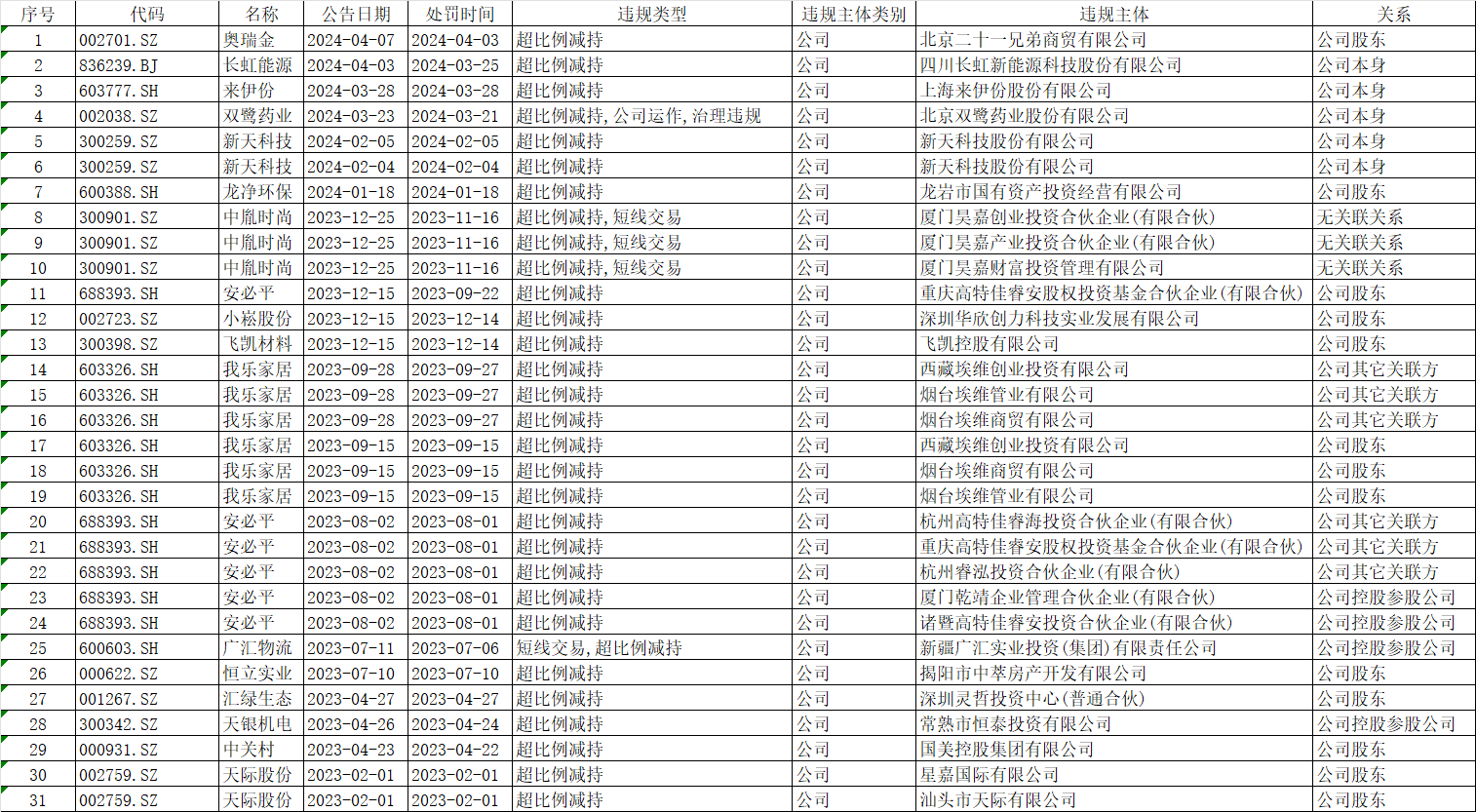 违规减持方面,2023年年初至今,31家A股公司因超比例减持、短线交易被监管处分。其中,我乐家居(603326.SH)因超比例减持被证监会江苏监管局公开处罚,处罚金额2260万元,为最高处罚金额。