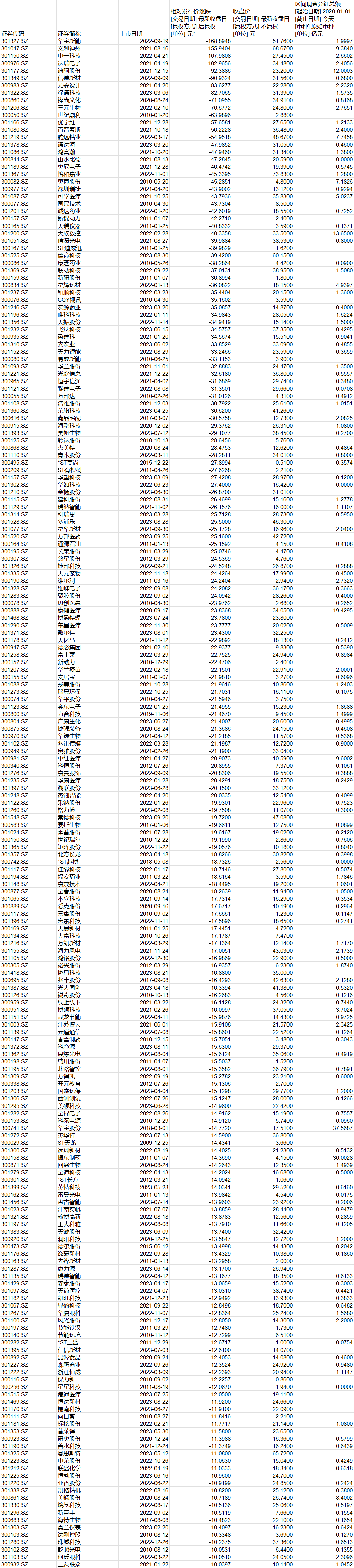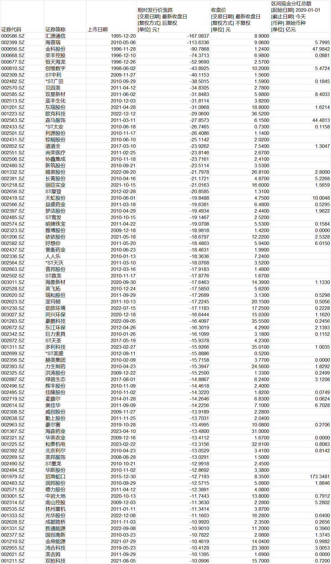 界面新闻记者发现,83家深市公司较发行价跌去超10元/股,其中,汇源通信(000586.SZ)、荣丰控股(000668.SZ)、ST中利(002309.SZ)、贝因美(002570.SZ)、蓝丰生化(002513.SZ)等个股2020年至今“零分红”。