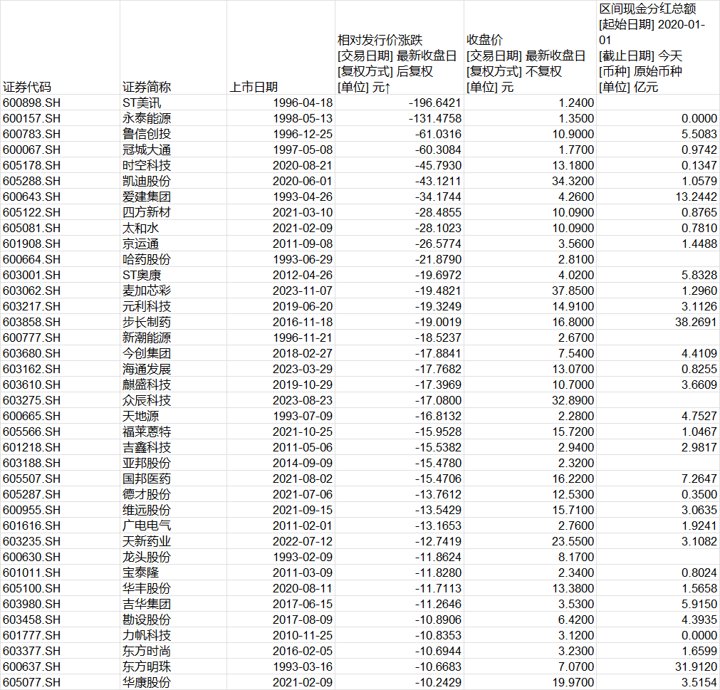 界面新闻记者发现,40家沪市公司较发行价跌去超10元/股,其中,ST美讯(600898.SH)和永泰能源(600157.SH)、哈药股份(600664.SH)、新潮能源(600777.SH)、众辰科技(603275.SH)、亚邦股份(603188.SH)等个股2020年至今“零分红”。