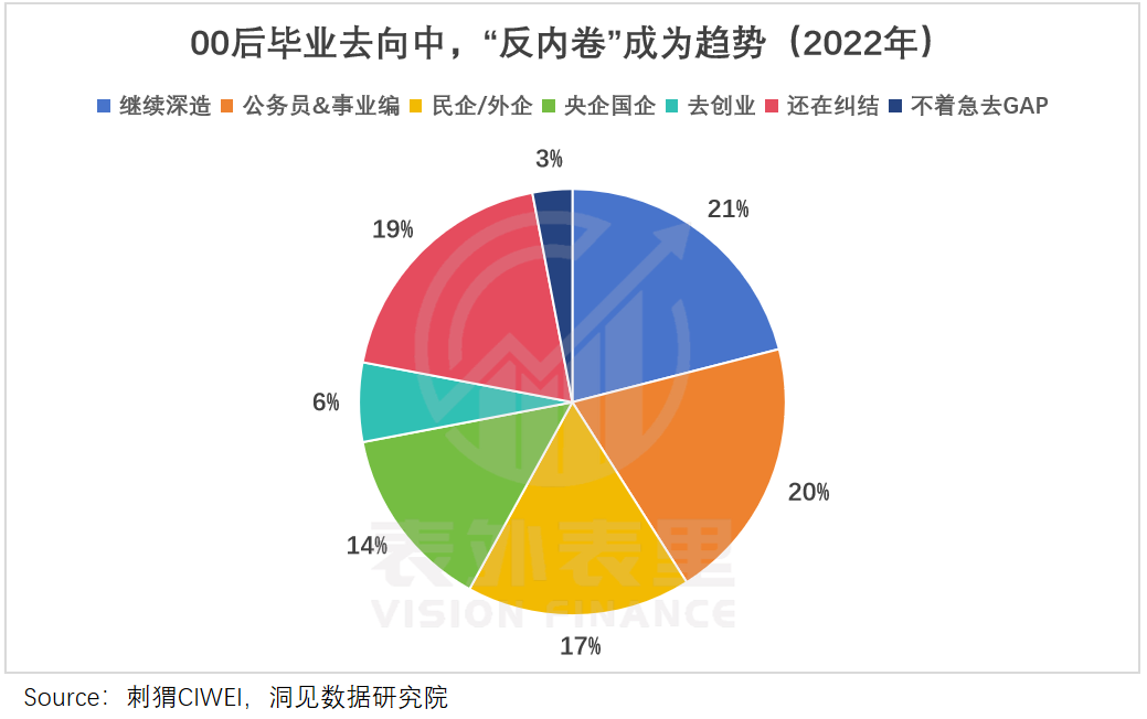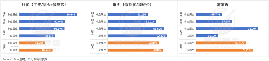 即使找工作,也明显变佛系起来。招聘平台的报告显示,比起95后、90后、85后,00后择业时对金钱回报的关注度明显下降,更在意“事情要少,回家要早。”