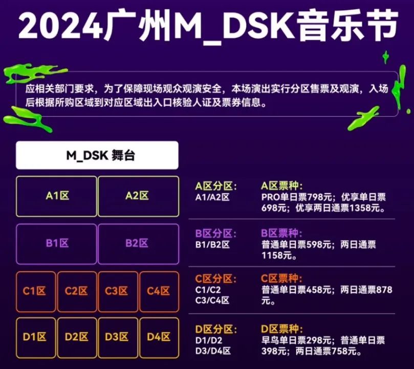 参加了广州M_DSK音乐节的乐迷鱼丸告诉惊蛰研究所,“我可以接受音乐节有位置分区,但像M_DSK音乐节那样子的,感觉分得不太合理:A区虽然卖得贵,但是位置并没有很好,除了靠中间的那一部分,左右两边离舞台都有点距离的,感觉中间那块屏幕都看不全。”