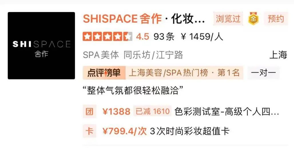 值得关注的是,“SHISPACE舍作”定价不菲,远超上海妆造店铺。根据大众点评APP,“SHISPACE舍作”的人均消费约为1492元,其中“高级个人四季色彩测试”团购价为1388元,销量已超过900份,也就意味着仅色彩测试一项已卖出超百万元。