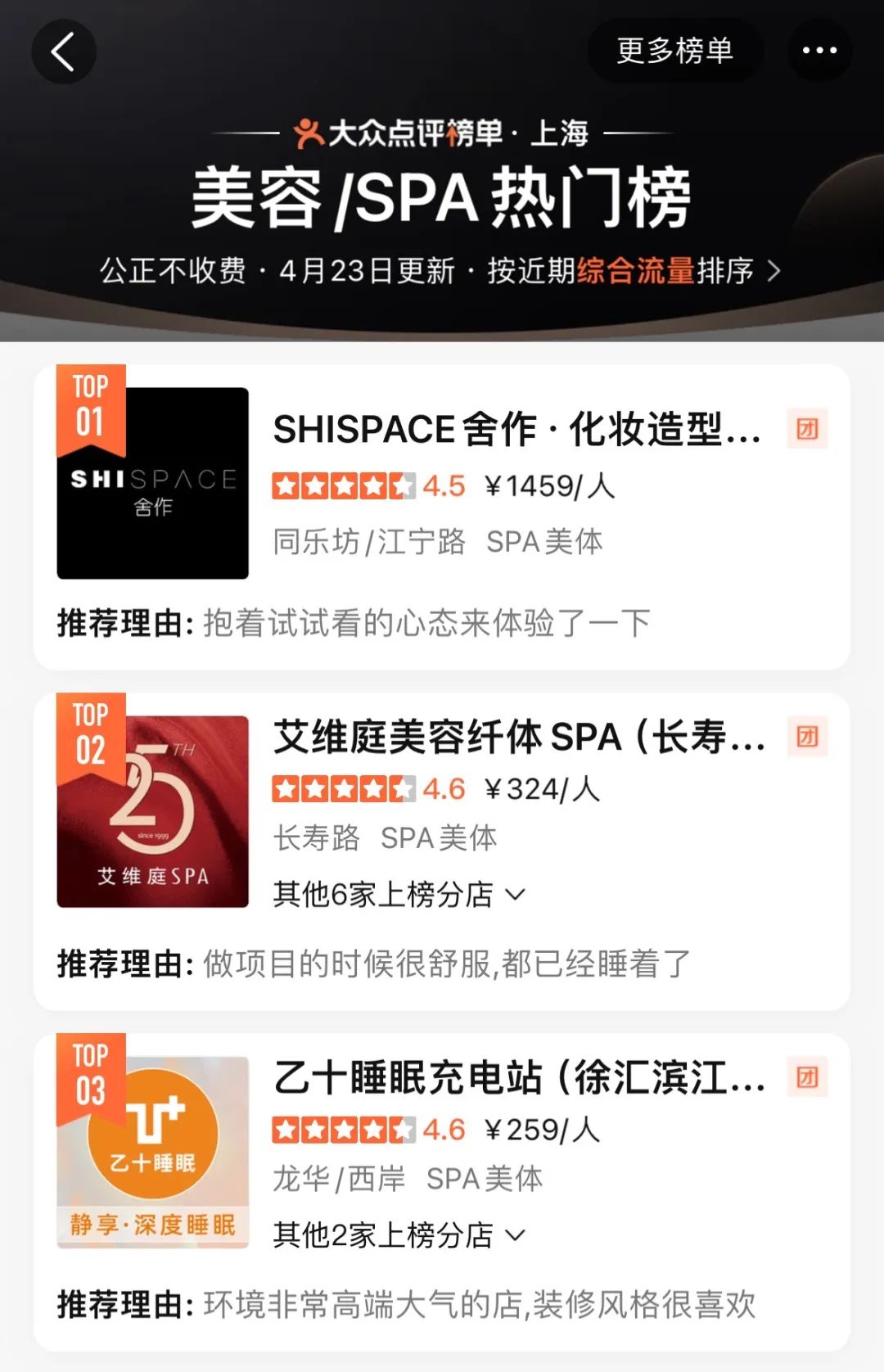 在今年1月份,号称是郭敬明开的“SHISPACE舍作”店铺开启试营业,开业仅4个月,就登上了大众点评网“上海美容/SPA热门榜”第一名。