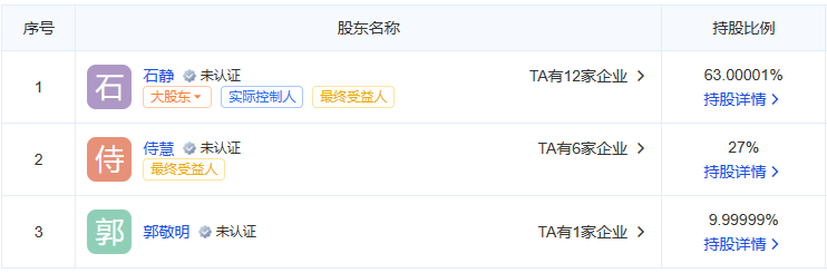 虽然郭敬明仅出现在关联企业的股东名单中,但在石静和侍慧持股的另一家名为上海柿野文化传媒有限公司中,郭敬明持股10%,出资11万元,为第三股东。