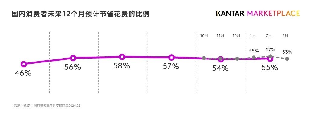 2024年以来,消费者掏钱的谨慎程度更甚从前。今年第一季度最新数据显示,在17个品类的节省花费预期上,52%的中国消费者预计在未来12个月节省花费。这个数字同比去年,上涨五个百分点,环比去年四季度上涨三个百分点。