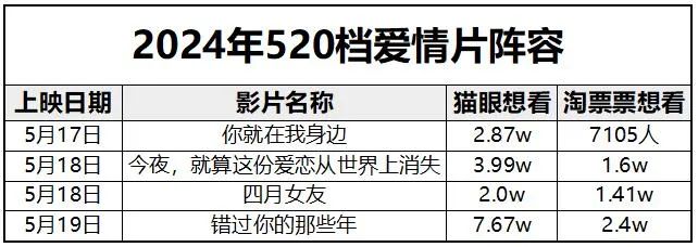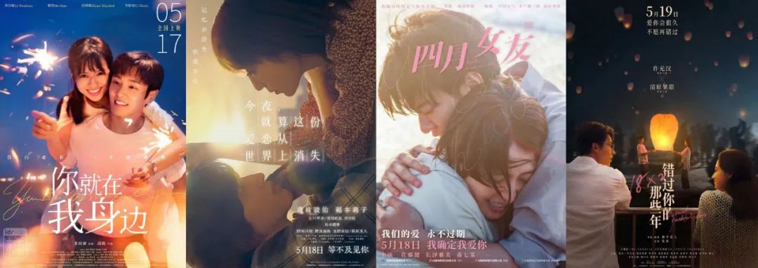 今年520档集齐了《今夜,就算这份爱恋从世界上消失》(下简称《今夜》)《四月女友》《错过你的那些年》三部爱情引进片,国产片方面却仅有“三无”爱情片《你就在我身边》一支独苗。