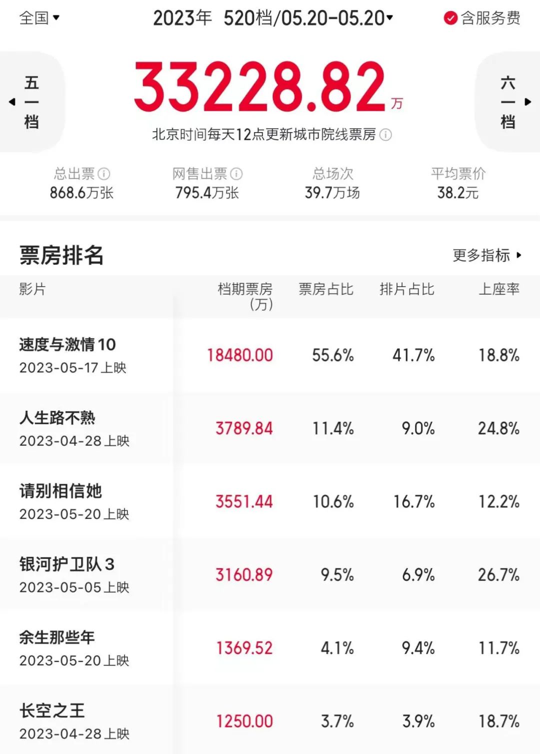 22年由于市场环境糟糕,仅有《我要我们在一起》一部重映爱情片,并顺利拿下当天票房冠军。23年520档虽有国产爱情片《请别相信她》和日本引进爱情片《余生那些年》两部爱情电影上映,却难敌《速激10》,仅分别拿到了这一天的第三名和第五名。
