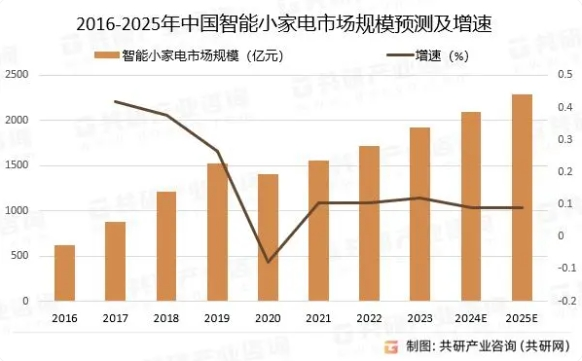 曾经不被看好的小家电,近几年却实现了规模的稳步增长。《2024-2030年中国智能小家电行业产业链全景研究及市场趋势预测报告 》显示,2023年,我国智能小家电市场规模约达1924亿元,预计2025年智能小家电市场规模将达2285亿元;未来智能家居将接入更多小家电产品,形成智能生活生态,带动智能小家电行业的扩大。