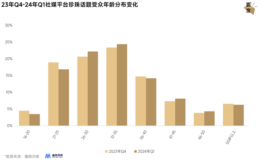23年Q4-24年Q1社媒平台珍珠话题受众年龄分布变化