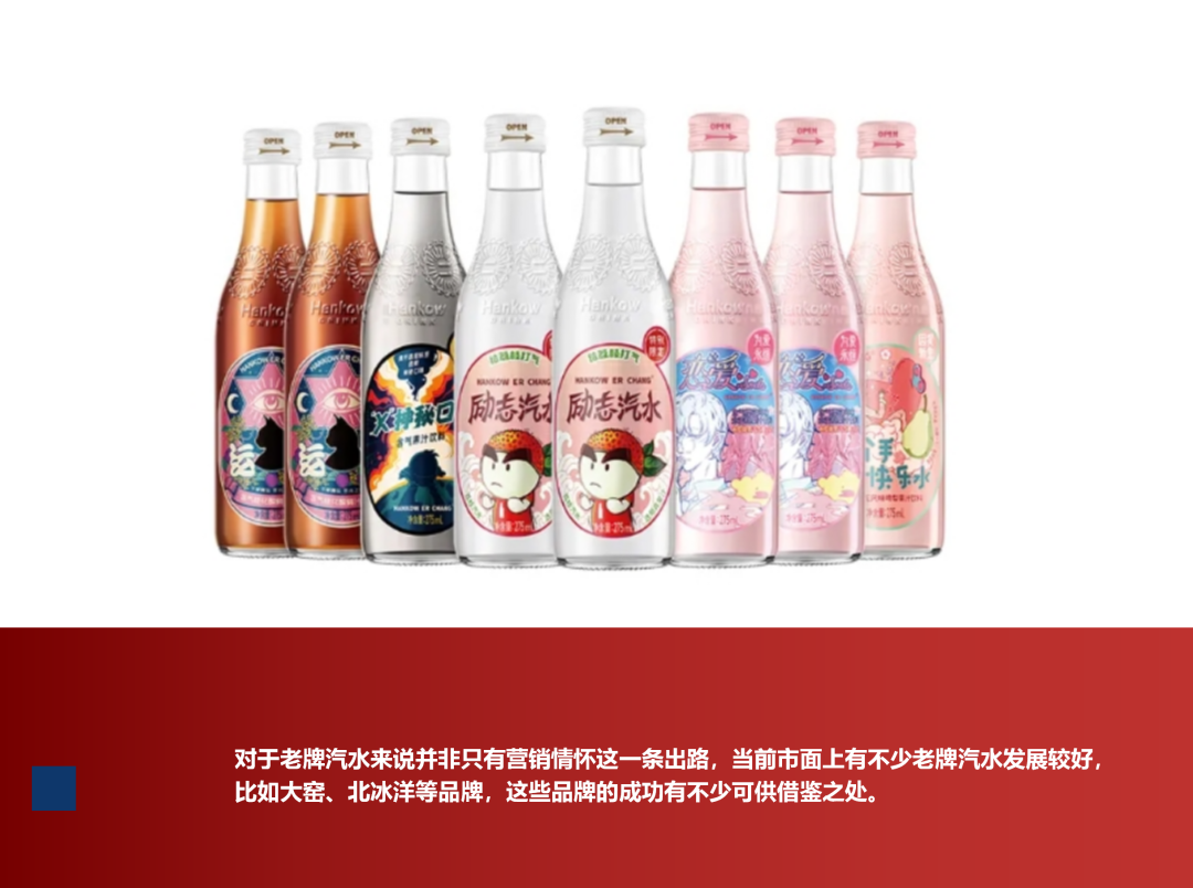 此外,老牌汽水地域特征较为明显,其情怀可能也只存在于本地消费者中,在全国范围内并不通用。想要可长久持续发展下去还要在更多方面下足功夫。较重要的是深耕产品,以品质在市场中立足,目前市场中部分老牌汽水正在通过改良配方、研发新产品等方式,满足新的市场需求。对于想要长远发展的品牌还是要靠品质,练好内功,适应当下竞争及经营环境,才能创造出独特的价值。