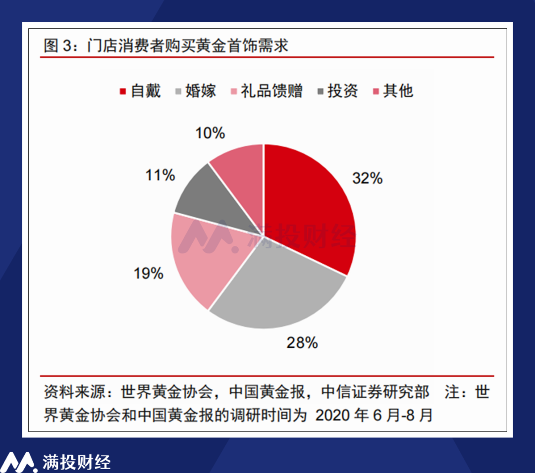具体到细分需求上,根据2020年一份调研报告显示,自戴+婚嫁需求是黄金珠宝门店消费的主要用途,结合后续的赠礼需求来看,合计占据了黄金饰品消费的79%,而投资属性只占了10.6%。尽管是一份有些过期的数据,但足以论证黄金是一个以消费场景为主的市场。