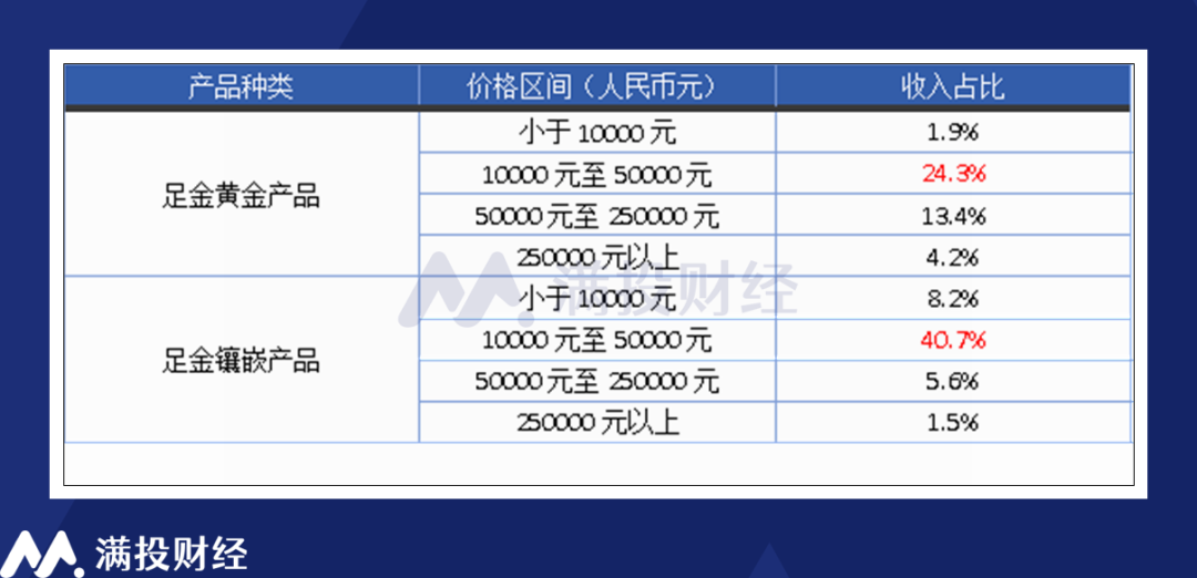 根据招股书显示,截至2023年,老铺黄金99%的产品为足金黄金/足金镶嵌产品,销售的产品中,单价大多都在1万元以上,其中10000元-25000元区间的产品占比达到65%,而1万元以下的黄金饰品所产生的收入仅占总额的10%左右。可以看出,公司明显锁定了中高端收入的客户群体,而基本完全放弃了低端黄金饰品的市场。在产品销售方面则大多依靠门店销售。
