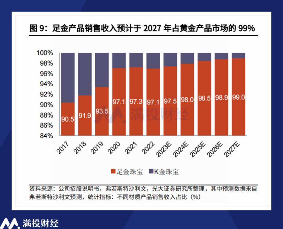 但另一方面来说,黄金的投资属性对金饰的工艺种类产生了较大的影响。以2022年的数据为例,足金类产品的销售常年维持在90%以上,且占比规模还在不断提升。而在足金产品中,又以普货黄金和古法金工艺为主。如果从单纯的外形考虑的话,K金与硬金理应有更高的市场需求,而会产生这样的情况,终究与足金“可回收”的特性脱不开干系。