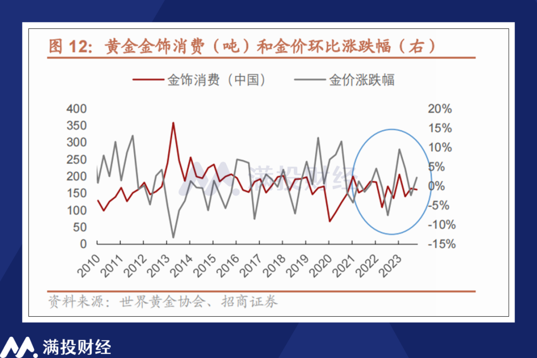 尽管与黄金的投资属性挂钩,且占据了黄金产能的主要需求,但金饰行业本质上还是奢侈品消费产业,因此会受到宏观消费能力,消费者消费意愿的影响,且与金价具有一定的负相关关系。但由于金饰复合了一部分投资属性,导致近年来国内的金饰消费有些“买涨不买跌”的特征,与金价的负相关并不算强烈,反而有些正相关的趋势。
