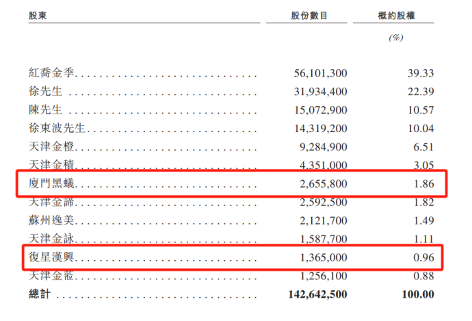 IPO前,厦门黑蚁和复星创富分别持有老铺黄金1.86%和0.96%的股份。