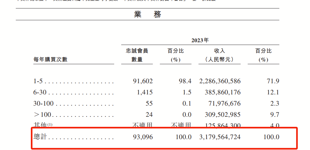 尽管门店数量少,但《招股书》显示,2023年,老铺黄金拥有超9.3万名忠诚会员(注册并发生购买的用户),其中,每年购买老铺黄金1-5次的会员,为公司贡献了22.86亿元,占公司总营收的比例为71.9%。