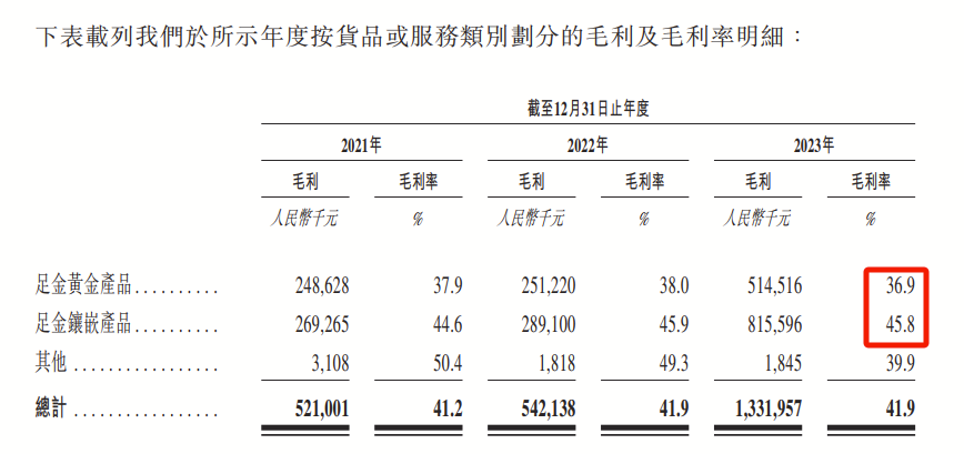 而此次,老铺黄金冲刺港股,毛利率连续三年仍高达40%以上。2021年-2023年,公司总体毛利率分别为41.2%、41.9%及41.9%。其中,公司黄金产品主要分为足金黄金产品、足金镶嵌产品,2023年这两者的毛利率分别为36.9%和45.8%。