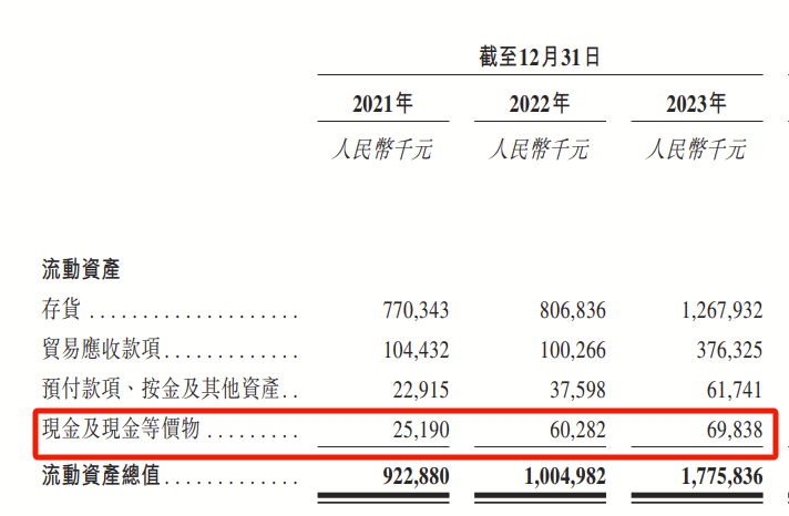 整体看,2021年-2023年,老铺黄金的现金流占流动资产比重均不足10%。这三年的现金及现金等价物分别为2519万元、6028.2万元和6983.8万元。