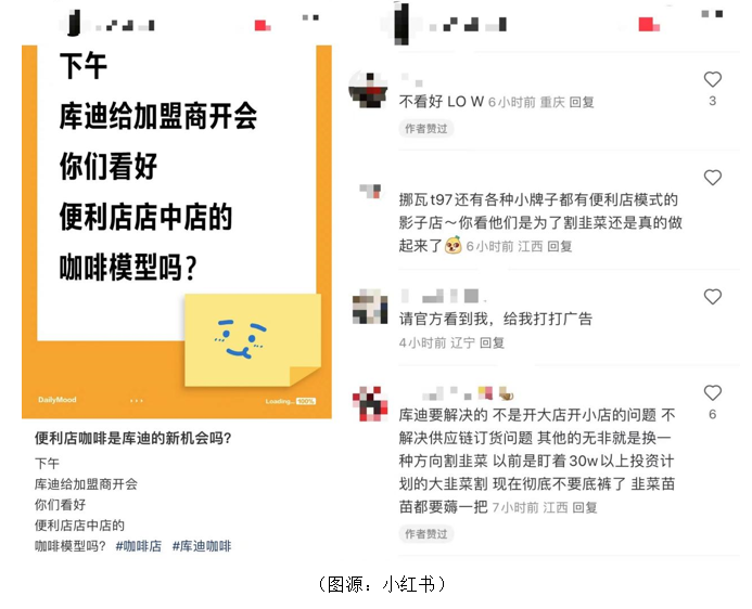 在小红书等社交媒体平台上,针对便利店店中店的咖啡模型,有人直言“不看好,low”,还有人吐槽“以前是盯着30万以上投资计划的大韭菜割,现在连韭菜苗都要薅一把。”