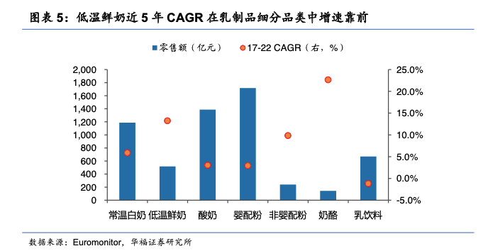低温鲜奶已经成为新的刚需,据Euromonitor数据,低温鲜奶的2017-2022年的CAGR达13%,增速靠前。