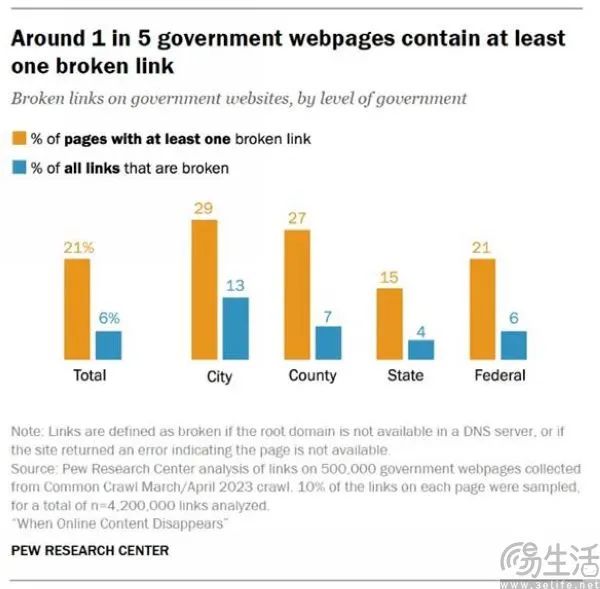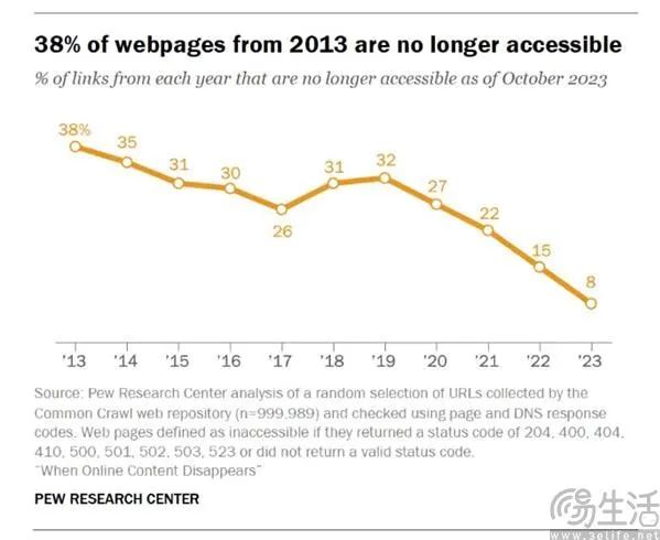 过去十年中,有四分之一的网页已经“失联”。不久前,美国著名智库皮尤研究中心发布了一份报告,其中显示,截至2023年10月,2013年至2023年期间存在的网页中有25%不再运行,而2013年之前就存在的网页中则有38%已无法访问,即便是在2021年上线的网页也有20%“失联”,2023年上线的网页同样有8%消失。